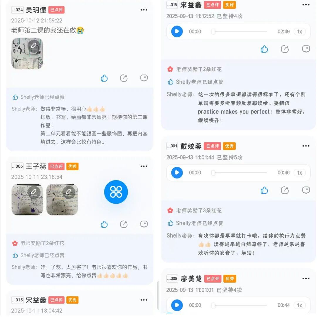 课堂之外,学习仍在延续。杨老师借助专业学习APP搭建英语学习监督平台,发起“每日英语任务”,涵盖课文朗读、背诵,词汇、语法等听说读写多维内容。她实时关注学生学习进度,及时给予反馈,让课外学习“有跟踪、有回应、有温度”,培养学生自主学习习惯。